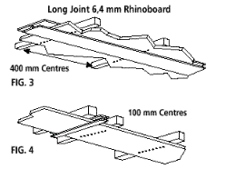 | 6,4 mm Rhinoboard M-Strip | 400 mm centres in one direction only. | 32 mm Galvanised semi-clout nails or 32mm grabber screws spaced at 150mm centres. |