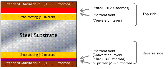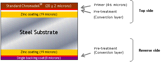 Chromadek is applied onto a galvanised coated substrate, which has been produced by the addition of Antimony and Aluminium to the molten zinc in the bath, to improve the formability and adherence of the zinc coating.