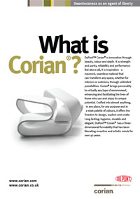 What is Corian®? DuPont™ Corian® is innovation through beauty, colour and depth. It is strength and purity, reliability and performance. But above all, it is inspiration - a maverick, seamless material that can transform any space, whether for interiors or exteriors, through unlimited possibilities. Corian® brings personality to virtually any type of environment, enhancing and facilitating the lives of those who use and enjoy its unique potential. Crafted into almost anything, in any place, for any purpose and in a wide palette of colours, it offers the freedom to design, explore and create. Long-lasting, hygienic, durable and elegant, DuPont™ Corian® has a threedimensional formability that has been liberating inventive and artistic minds for over 40 years. |