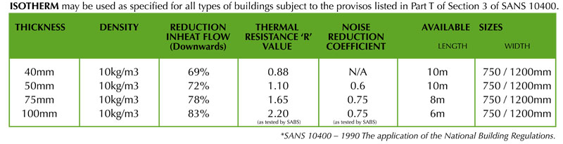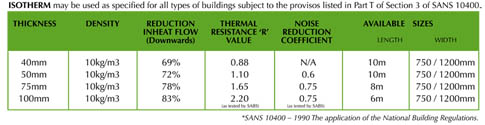 Behaviour in fire ISOTHERM does not support combustion when installed as specified and used in applications described. (ISOTHERM may be used as specified for all types of buildings subject to the provisos listed in Part T of Section 3 of SANS 10400*) ASTM – E84:
