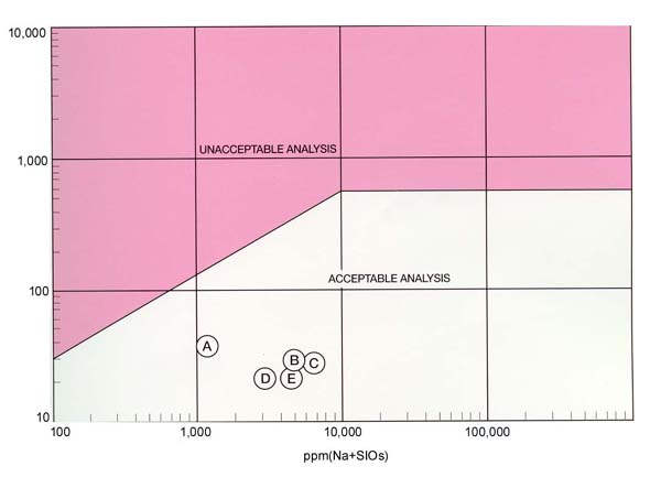 Westinghouse-Karnes method. The acceptability conditions in this test are comparatively severe because of the intended application in nuclear plants. The chemical analysis of chlorides, fluorides and sodium silicates present in the insulation are plotted on the Karnes diagram, which has acceptable and unacceptable analysis zones. The sodium and silicate ions have a corrosion inhibiting action on the chlorides and fluorides, which is important.