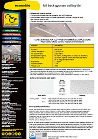 Econotile foil back gypsum ceiling tileThe Econotile Ceiling System as tested did not propagate flaming during the standard SANS 10177-10 test. Econotile have a foil backing that increases the thermal resistance and NRC properties of the tile as well as encapsulated (taped) edges to limit water penetration promoting a longer life span and minimizing gypsum dust. With a Fire classification: CLASS B/B1/2, available in 9mm or 12mm thick and either a white or fissured surface pattern. |